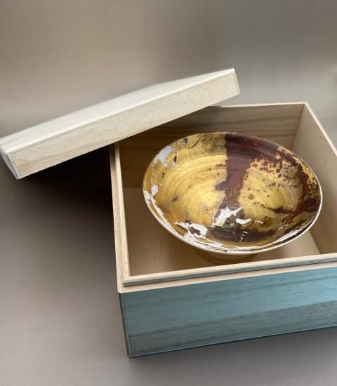 This is a work featuring a design applied with special lacquer onto the ceramic surface. It is a novel ceramic series created using lacquerware coating techniques to achieve expressions unattainable with pottery alone.